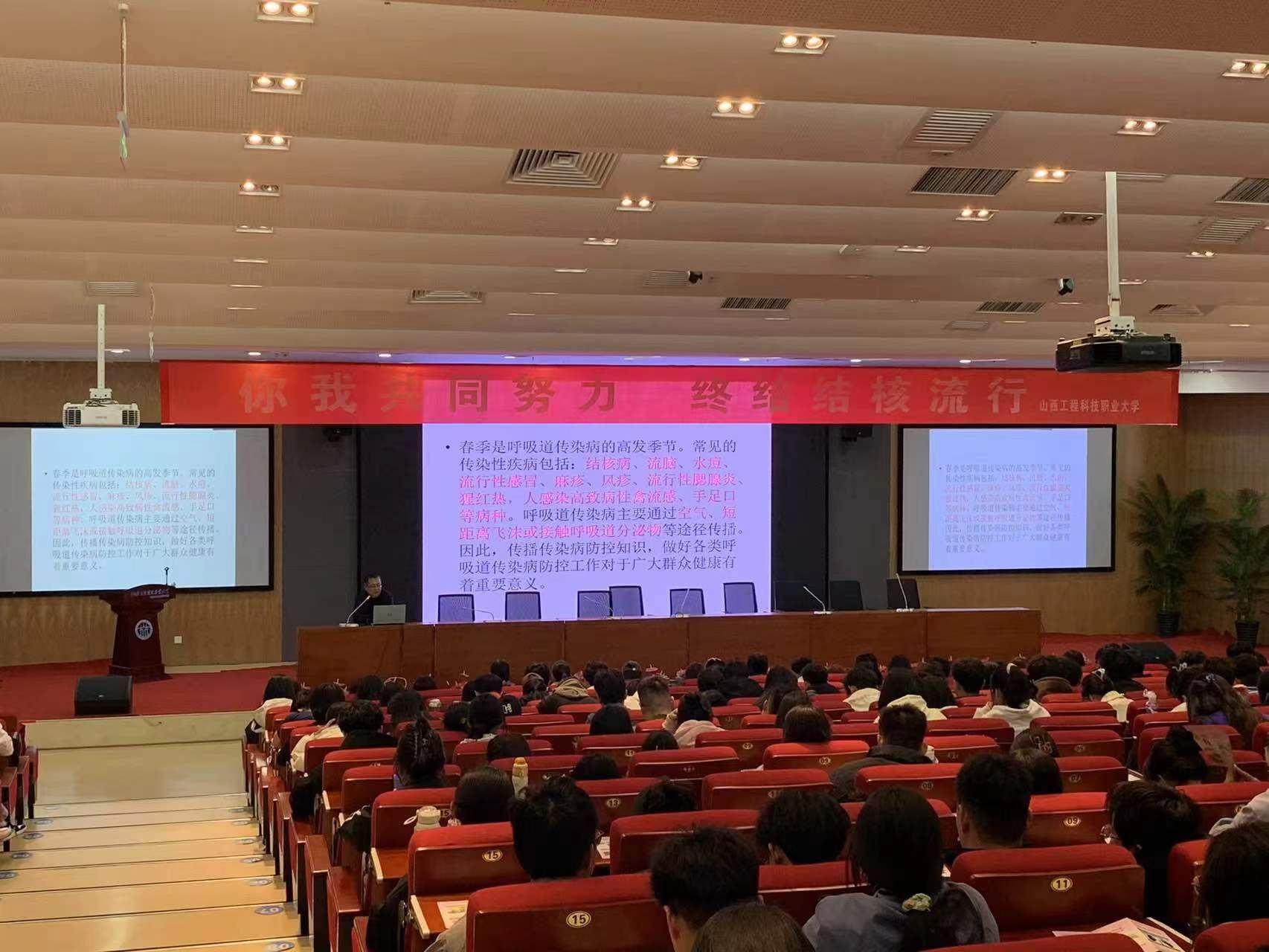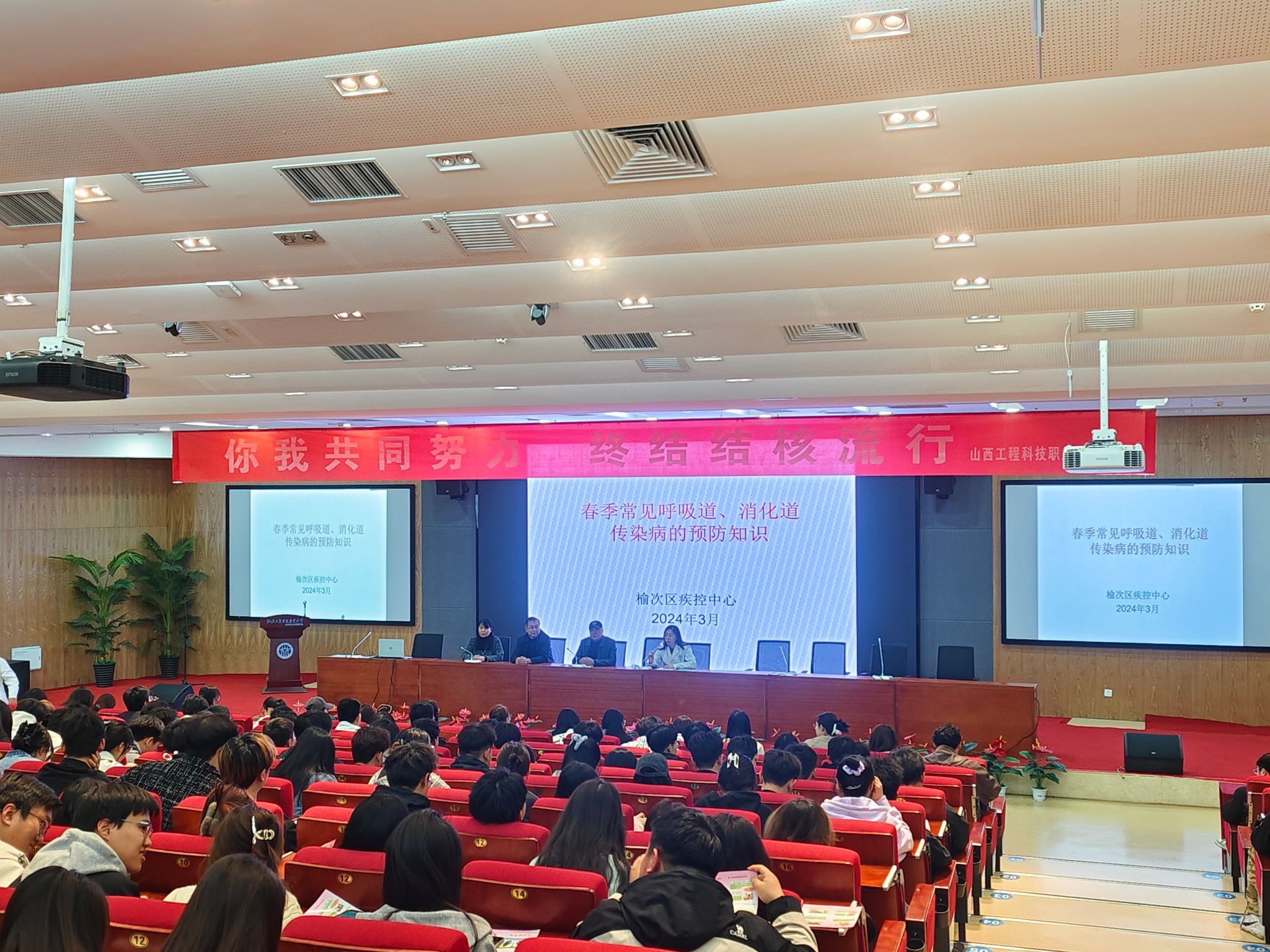 在第29个“世界防治结核病日”即将来临之际,3月20日下午,卫生健康服务中心联合榆次区疾病预防控制中心、北部新城高校社区卫生服务中心共同开展了宣传防治结核病的主题教育、知识咨询等专项活动,并在东区图书馆一层报告厅举办了“大学生春季常见呼吸道、消化道传染病专题讲座”。榆次区疾控中心冯永胜主任受邀为学校师生作专题讲座。卫生健康服务中心主任王红英主持讲座,后勤保卫部王晔副部长和北部新城高校社区卫生服务中心常英娥主任参加了本次活动。